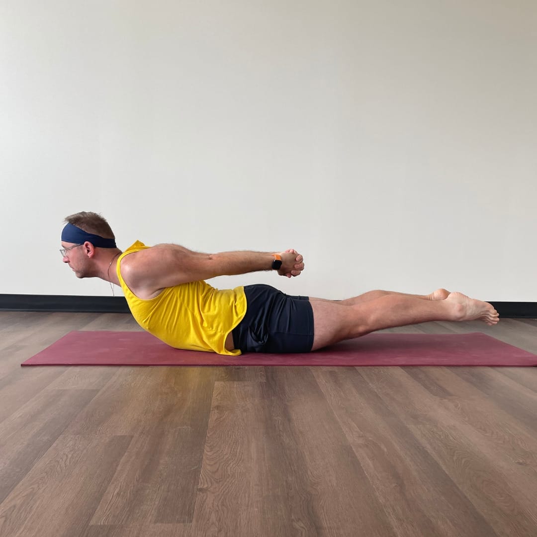 Bring your third eye to the ground + connect, clearing your inner vision + acknowledging the Self in this ultra chill posture. Lie down on your belly, extend the arms overhead and let them rest on the ground. Find as much space between the legs as you need of feel comfortable. If it is too much to feel your face on the floor, use a blanket as a pillow, or turn to one cheek. To relieve pressure in the low back, bring a rolled up towel or blanket beneath the ankles. Take many deep breaths here, drawing your awareness to the rolling sensation of the belly along the floor.