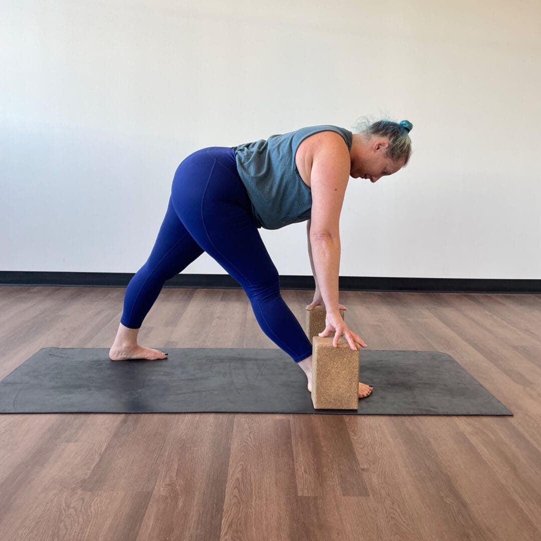Bow forward in honor of your most solemn vows. Stand with your feet 2 – 3 feet apart. Align your front toes forward and your back toes with a slight turnout. Hinge at your hips and bow forward over your legs. In Pyramid pose, we often talk about squaring the hips, trying to feel your hips even and balanced. You can check in with this by placing one hand to the low back and feeling any un-level-ness. We often see students practicing this pose with their legs in one straight line, now let us be clear, there is nothing wrong with that. However, if this makes squaring the hips or folding forward inaccessible, try widening the stance of your feet. Think hip width stance or even mat width stance. Play around with what feels best in your body. And remember — blocks to support the hands here are an awesome addition!
